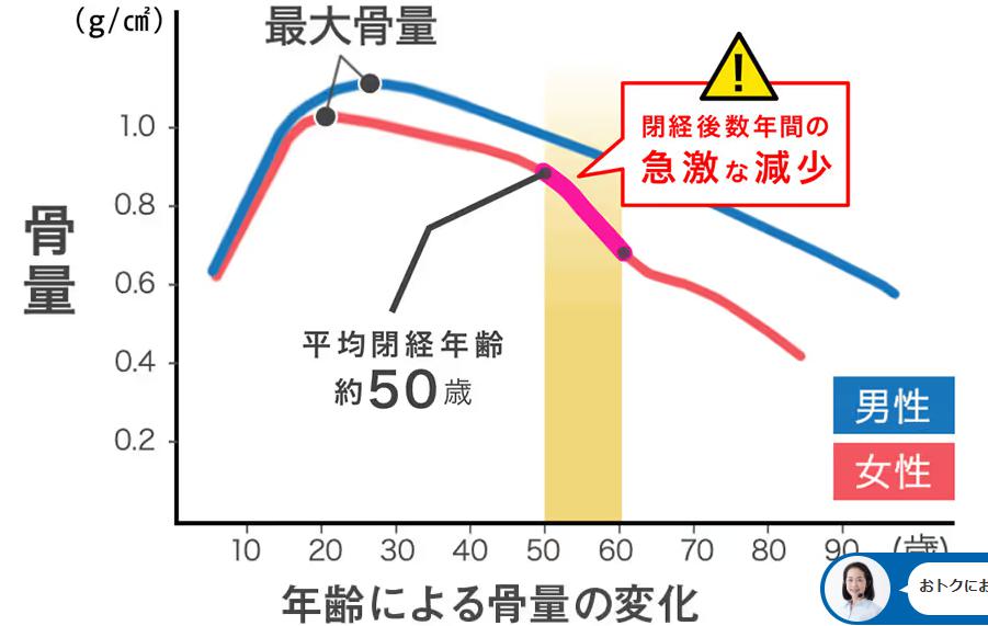 特に女性の場合は50~60代になると生理がなくなり閉経状態になると骨の骨量は